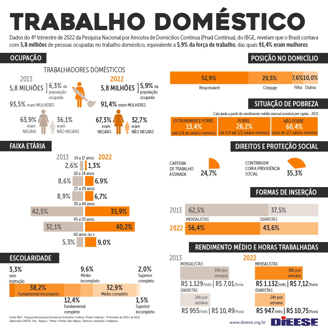 Ainda no tocante ao perfil da trabalhadora doméstica, após 2013, foram aprofundadas tendências já observadas em anos anteriores, como envelhecimento da categoria, aumento da escolaridade – inclusive com aparecimento das trabalhadoras com nível superior completo – e menor participação do emprego doméstico na estrutura ocupacional feminina, sobretudo no caso das mulheres negras.